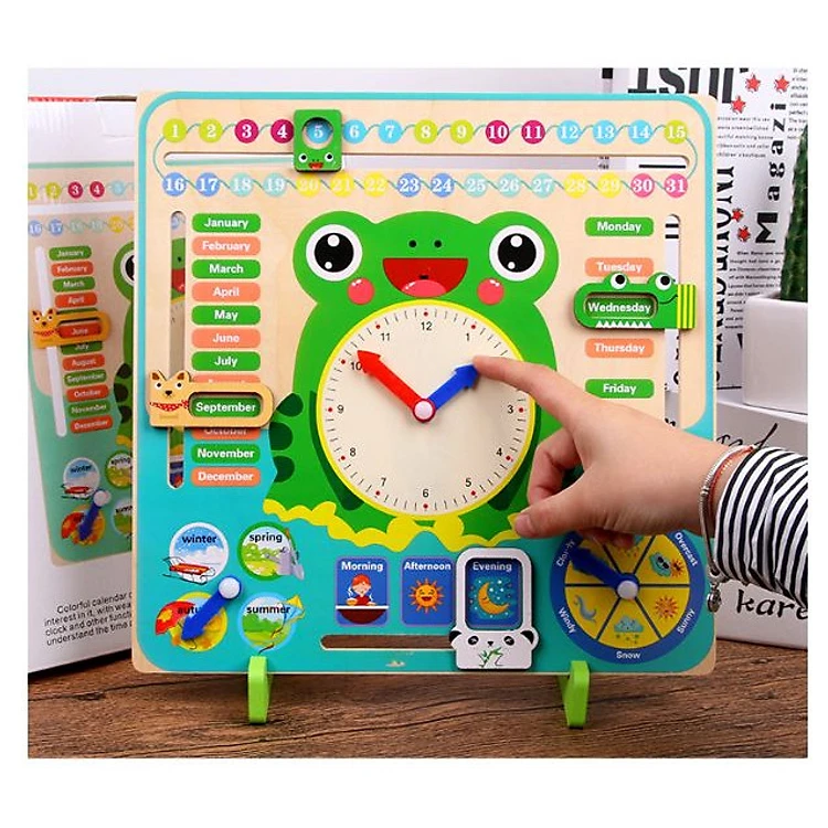 + Gồm 1 bảng gỗ được thiết kế để bé học được giờ, thứ- ngày - tháng, các mùa, buổi chỉ trong cùng 1 bảng.