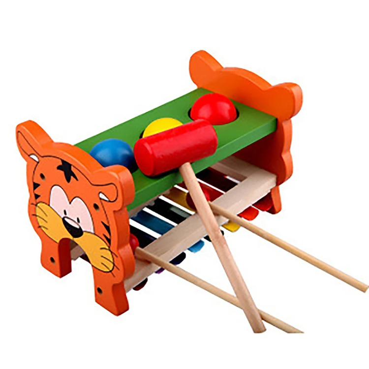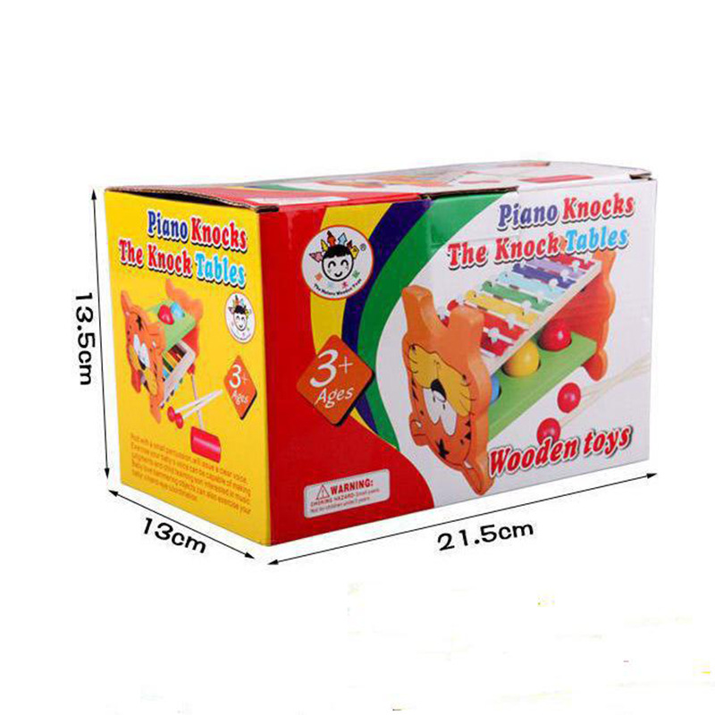 - Đồ chơi gỗ gõ phát ra âm thanh là sản phẩm có thiết kế 2 in 1, mặt trên là ba lỗ hổng hình tròn, khi chơi bé đặt lên đó các trái bóng có đường kính tương đương, sau đó dùng búa nhỏ gõ chính xác lên các trái bóng sao cho chúng lọt qua và rơi xuống.