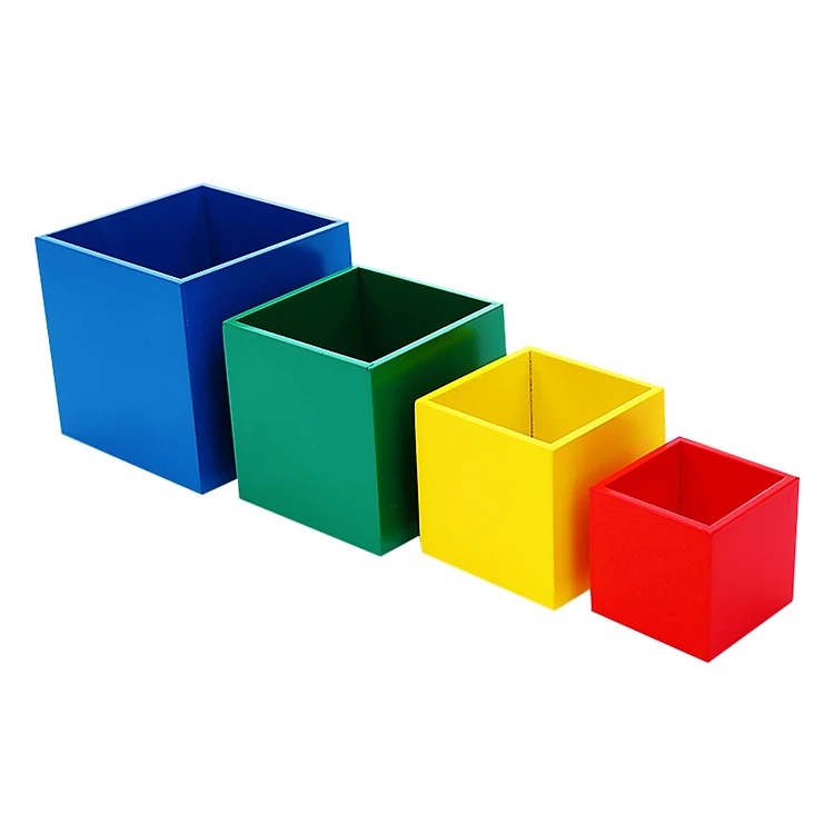 - Lồng hộp vuông 4 hộp bộ to gồm 4 khối hình vuông, bé có thể xếp chồng lên nhau hoặc lồng vào nhau.