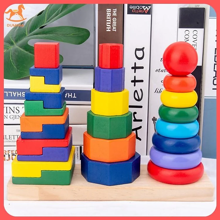 Thiết kế tháp cầu vồng bằng gỗ gồm hình khối và kích thước khác nhau được xếp theo trật tựu từ to đến nhỏ, từ nhỏ đến to tùy ý sáng tạo của bé
