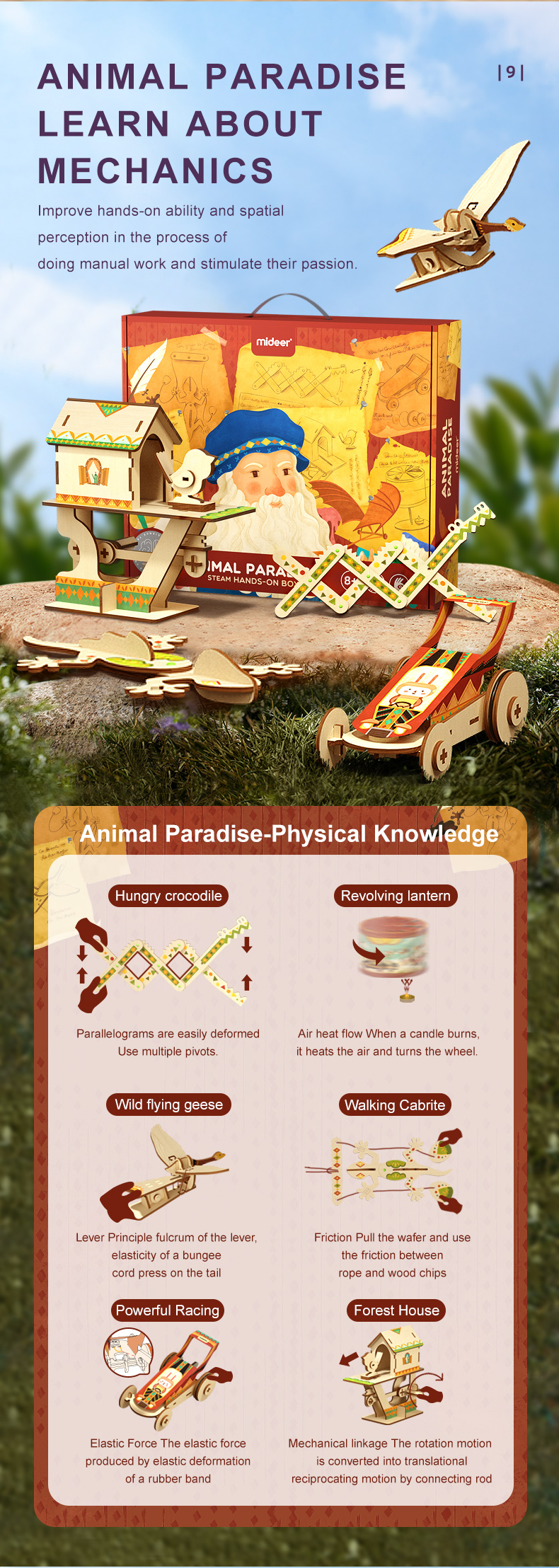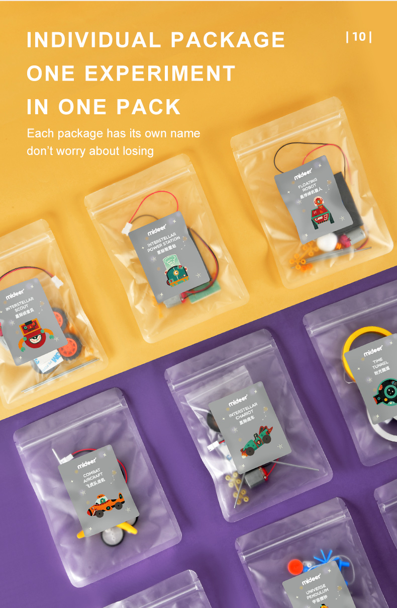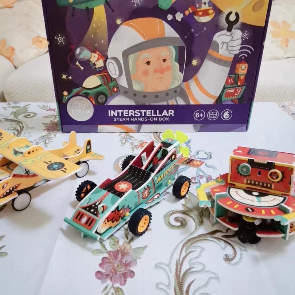 Với bộ đồ chơi khoa học STEAM của hãng Mideer, bé được tự tay lắp ráp các loại phương tiện, robot, máy móc (INTERSTELLAR), các hành tinh, vũ trụ (UNDER THE STARS) cũng như các loài động vật (ANIMAL PARADISE) đúng kiểu DIY với các thành phần bằng foam cứng, được cắt bằng máy sẵn sàng, dễ dàng lắp ráp và chạy được bằng động cơ.