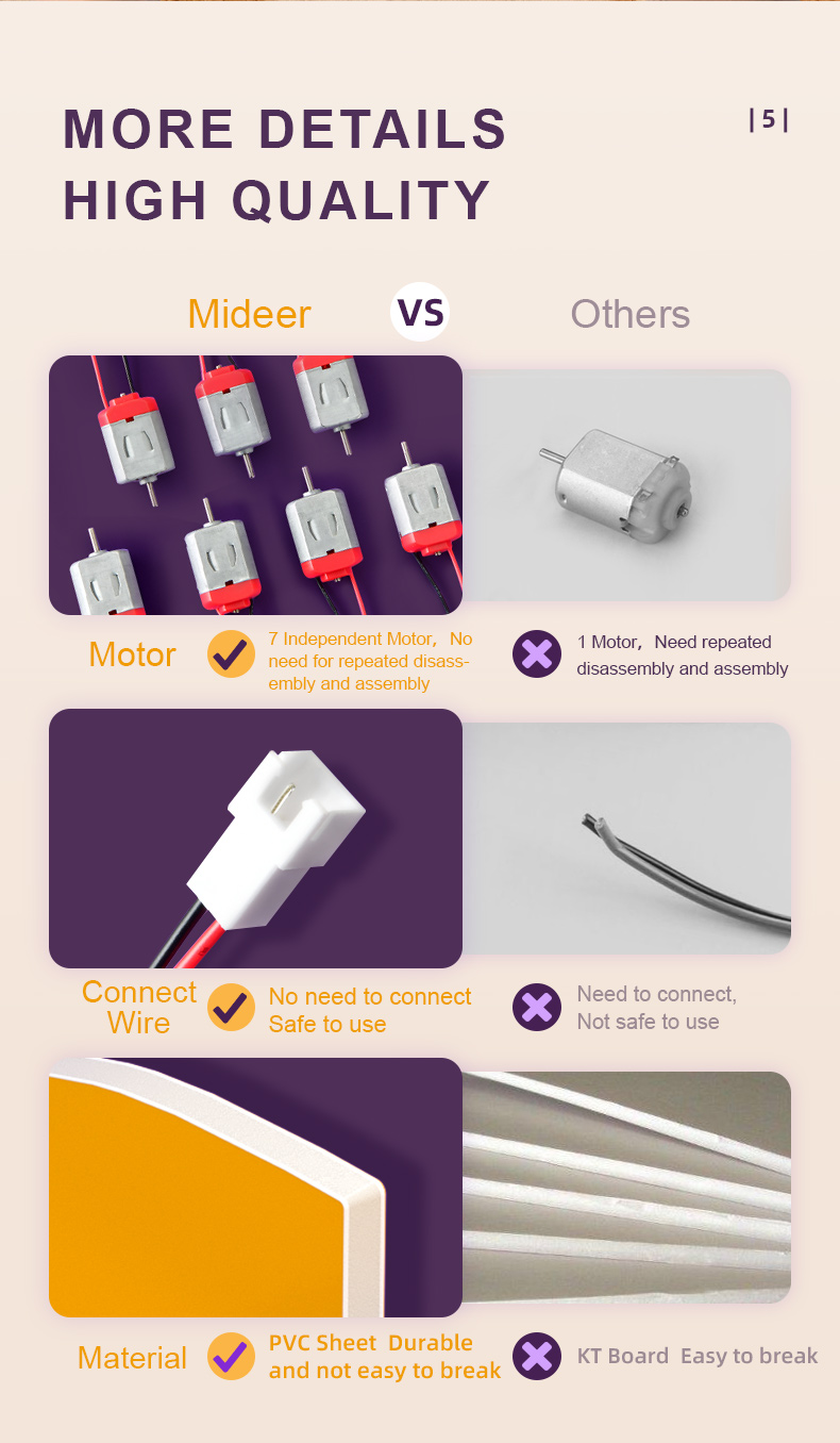 Bộ sản phẩm đồ chơi khoa học STEAM của Mideer phù hợp cho các bé từ 6 tuổi trở lên, hãng đã cung cấp các động cơ motor kèm các đầu nối điện nhanh, giúp bé dễ dàng lắp ráp và sử dụng, đồng thời cũng cực kỳ an toàn cho các bé.
