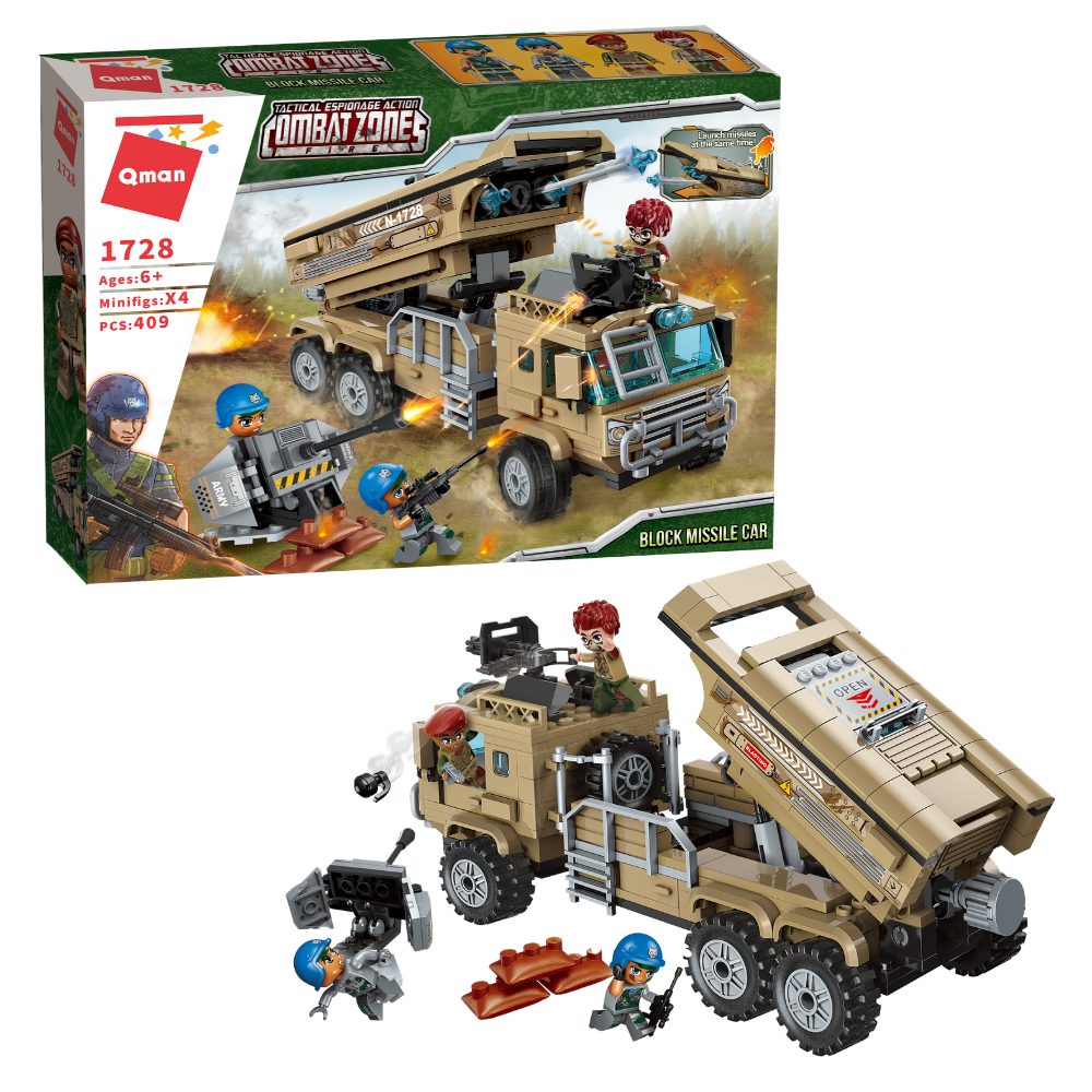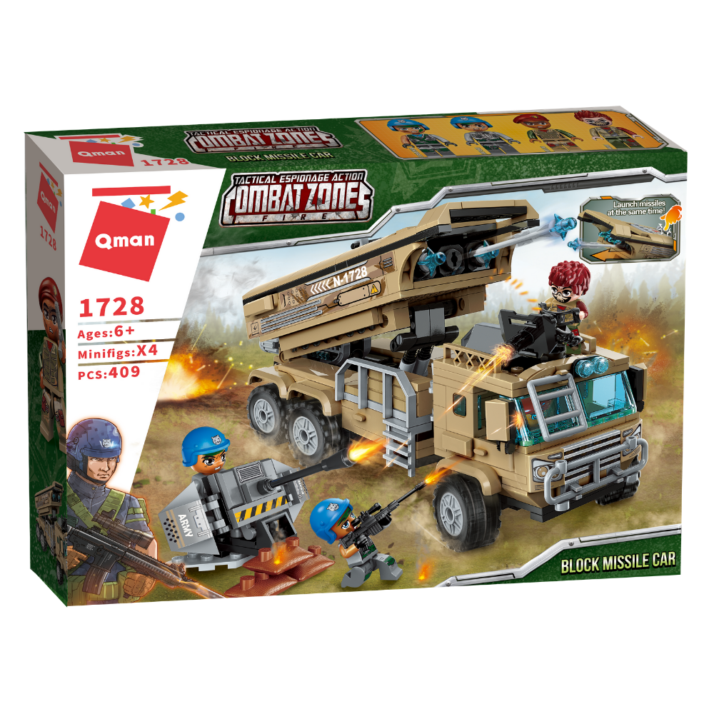 Bộ lắp ráp Xe phóng tên lửa Qman 1728 (409 chi tiết) mô phỏng câu chuyện của biệt đội phóng tên lửa đụng độ những tên cướp cực ngầu. Sản phẩm nằm trong dòng Combat Zone của thương hiệu đồ chơi lắp ráp nổi tiếng Qman, giúp bé phát triển tư duy và khả năng sáng tạo.