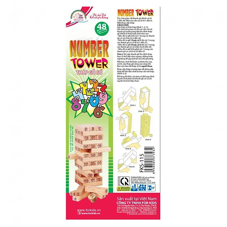 • Đồ Chơi Rút Gỗ Số NumberTower Forkids gồm những thanh gỗ có hình dạng giống như viên gạch được mài nhẵn, vừa giúp bé giải trí lại vừa kích thích sự phát triển trí não của bé trong những năm tháng đầu đời. Sản phẩm gồm 48 khối gỗ, kèm theo viên xí ngầu dùng để xác định lượt chơi.