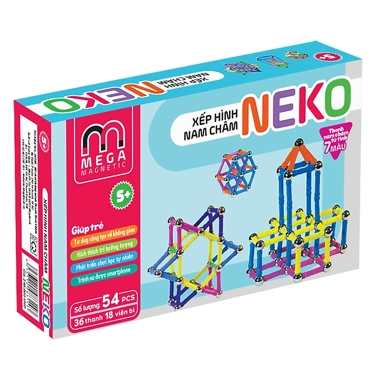 Đồ Chơi Thông Minh Mega Magnetic Thanh Nam Châm Từ Tính 7 Màu Thanh Ngắn (Bộ 36 Thanh, 18 Bi) - Hộp Xanh Dương