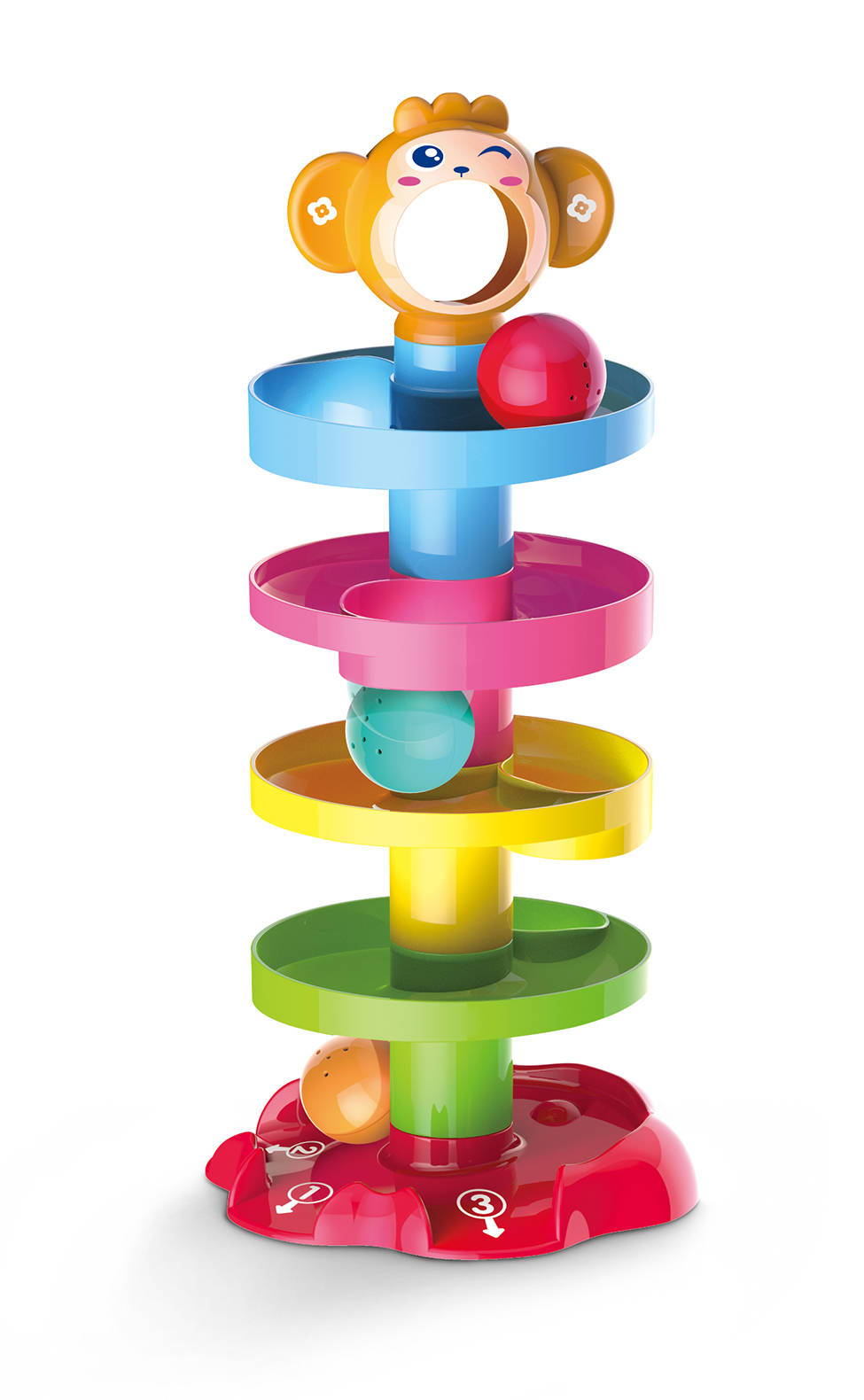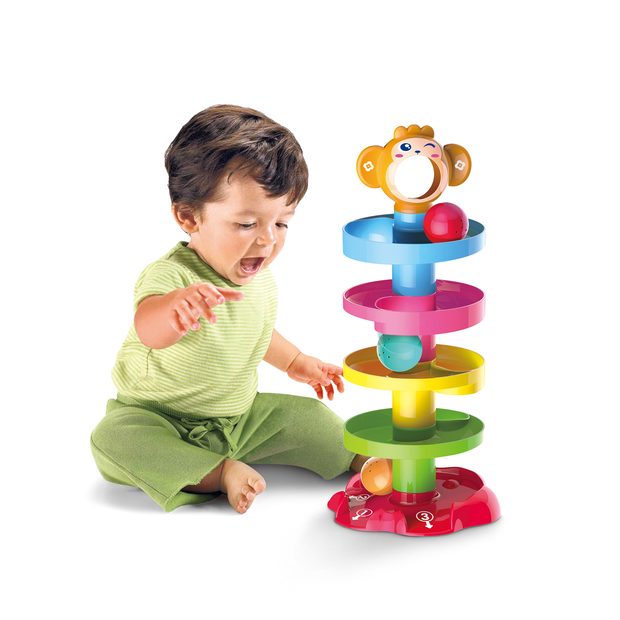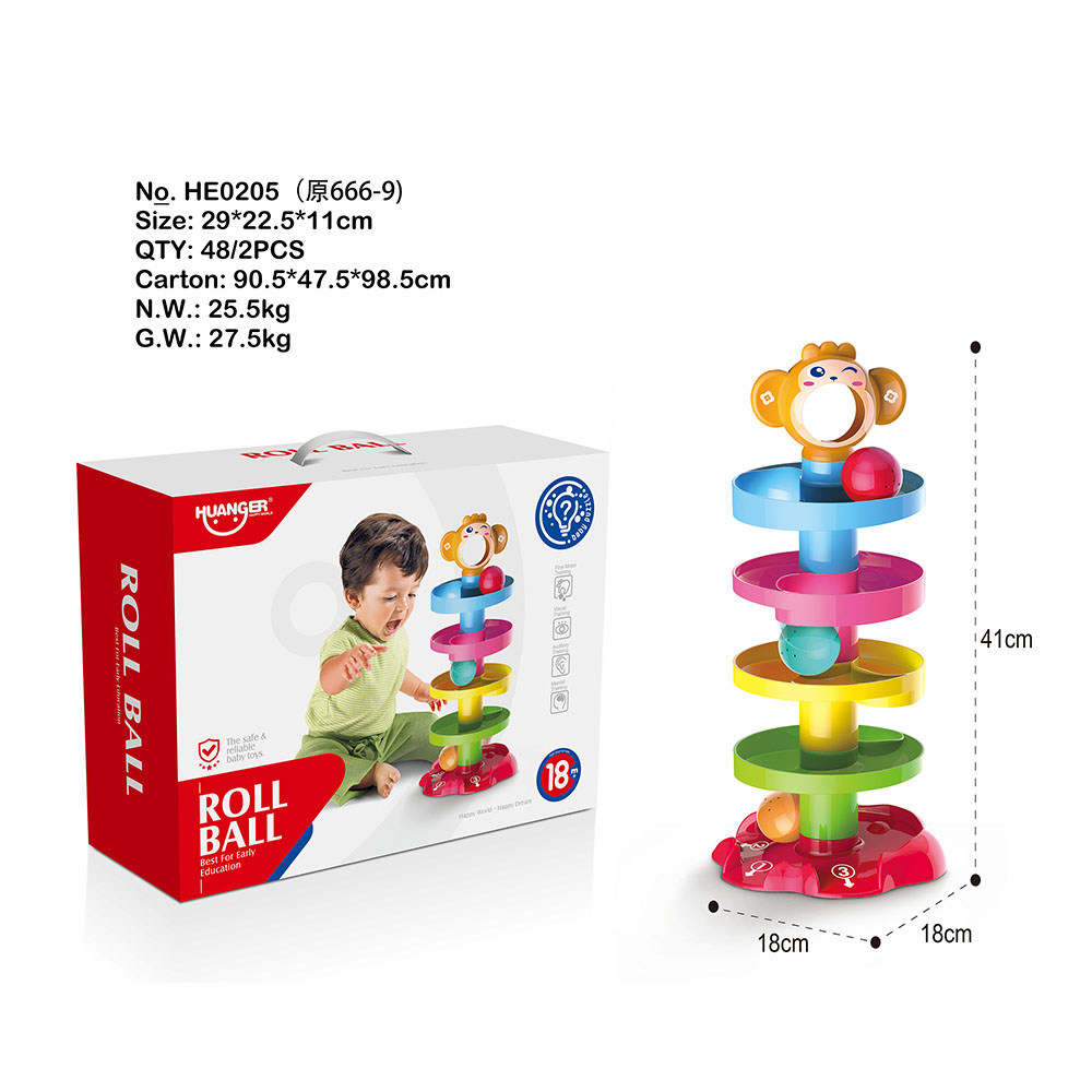 - Đồ chơi có thiết kế 5 tầng tháp là 5 màu sắc khác nhau, bé để bóng vào miệng chú khỉ và để bóng lăn từ đỉnh tháp xuống đáy tháp. Khi quả bóng lăn có phát ra âm thanh vui nhộn làm bé thích thú.