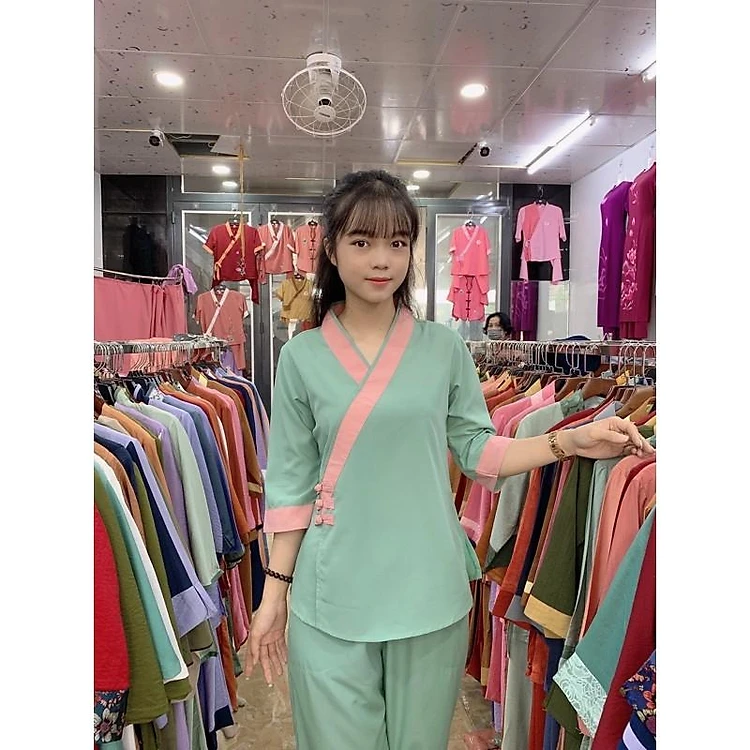 Đồ đi chùa, thời trang nữ đồ lam đơn giản trơn không thêu phối đính nút