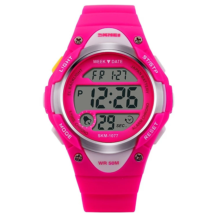 Đồng Hồ Bé Gái Dây Plastic SKMEI SK-DG1077 - Hồng là phụ kiện thời trang mang đến cho bé vẻ ngoài năng động và cá tính. Kiểu dáng thể thao khỏe khoắn với mặt hình tròn kết hợp dây đeo cao su hình bánh xe, khiến bé trở nên thu hút hơn. Bên cạnh đó, mặt hiển thị đầy đủ với giờ điện tử, lịch ngày tháng cùng chức năng báo thức và bấm giờ thể thao, giúp bé thuận tiện sử dụng theo dõi thời gian trong ngày.