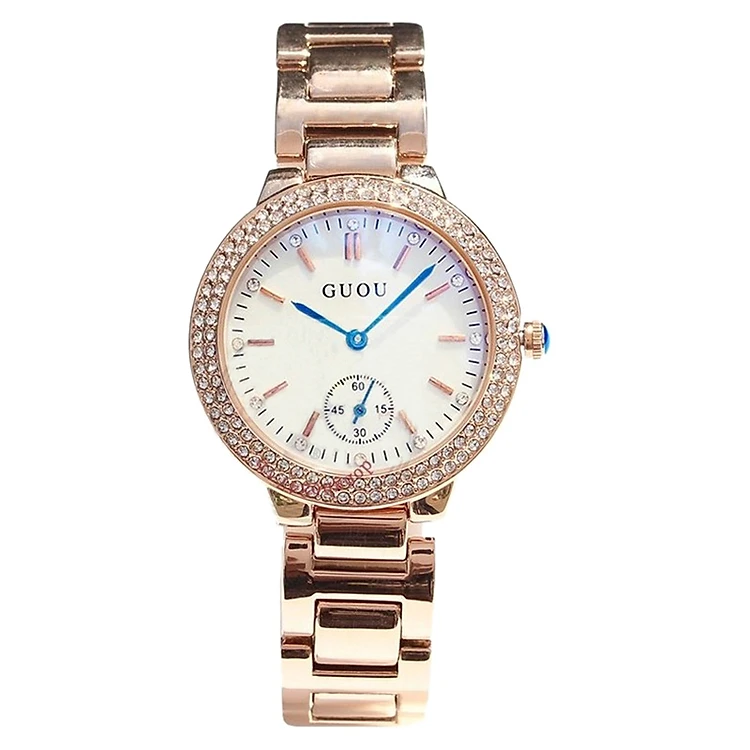 Đồng Hồ Nữ Dây Thép GUOU Phong Cách Âu Mỹ TM270 (Mặt Trắng) sở hữu kiểu dáng thanh lịch, nữ tính với dây đeo mạ ion vàng hồng cao cấp. Kim giờ màu xanh lam nổi bật trên nền trắng của mặt kính, tạo điểm nhấn ấn tượng sắc sảo. Các con số thể hiện dưới dạng vạch kẻ truyền thống, có màu vàng hồng cùng tông dây đeo, phối cùng những viên pha lê lấp lánh tạo dáng vẻ điệu đà, sang trọng.