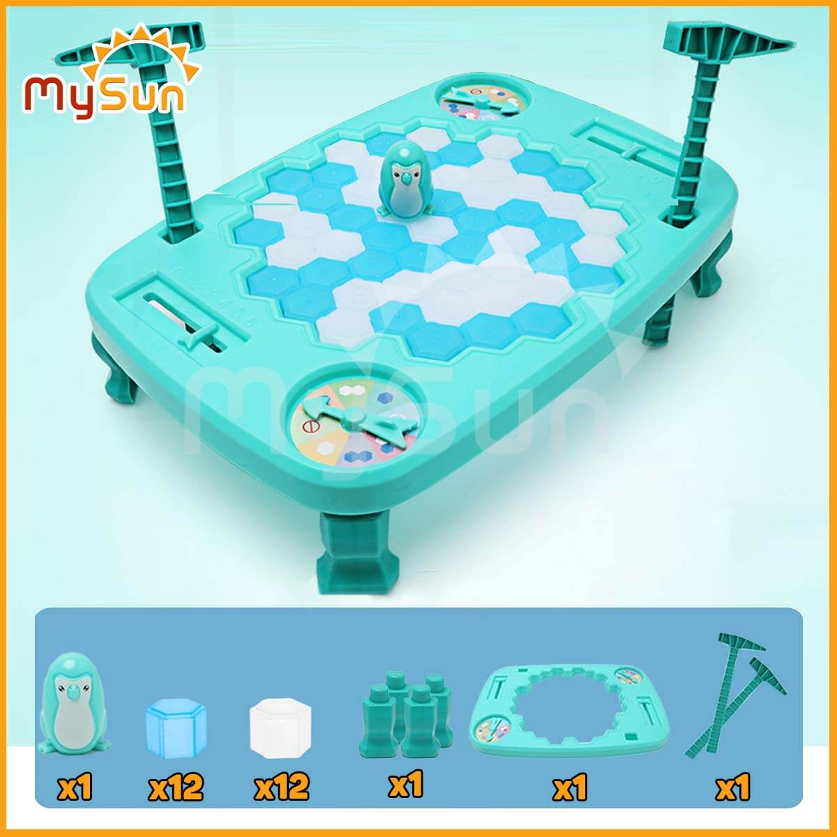 - Một bộ gồm 2 chiếc búa, 1 bàn chơi, 1 chú chim cánh cụt, 1 bàn xoay và các viên lục giác.