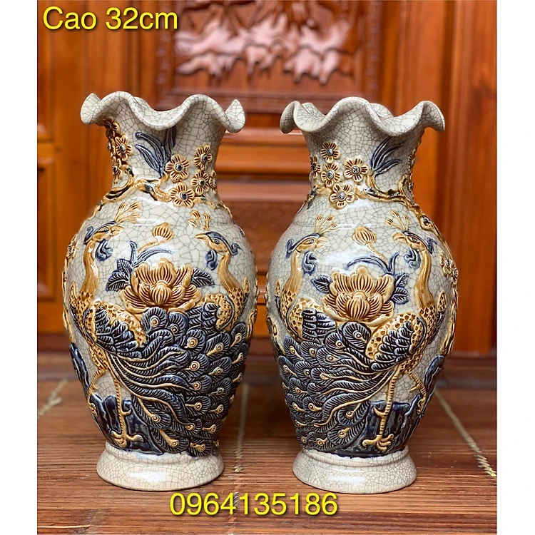 Đôi lọ lục bình thờ men rạn đắp công đào nổi h32cm gốm sứ Bát Tràng