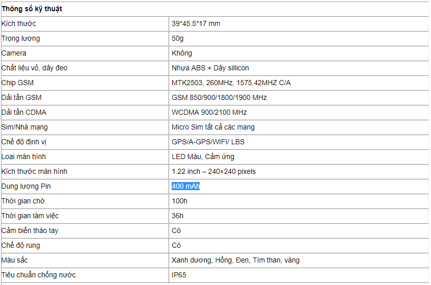 - Dung lượng Pin 400 mAh