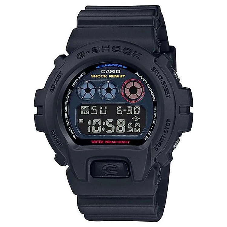 Mẫu cơ bản là mẫu DW-6900 phổ biến với ba mặt số. Màu đen huyền cơ bản kết hợp với các màu sắc giống ánh sáng đèn neon đã tạo nên thiết kế G-SHOCK vừa thời trang vừa chắc chắn.