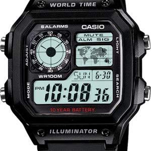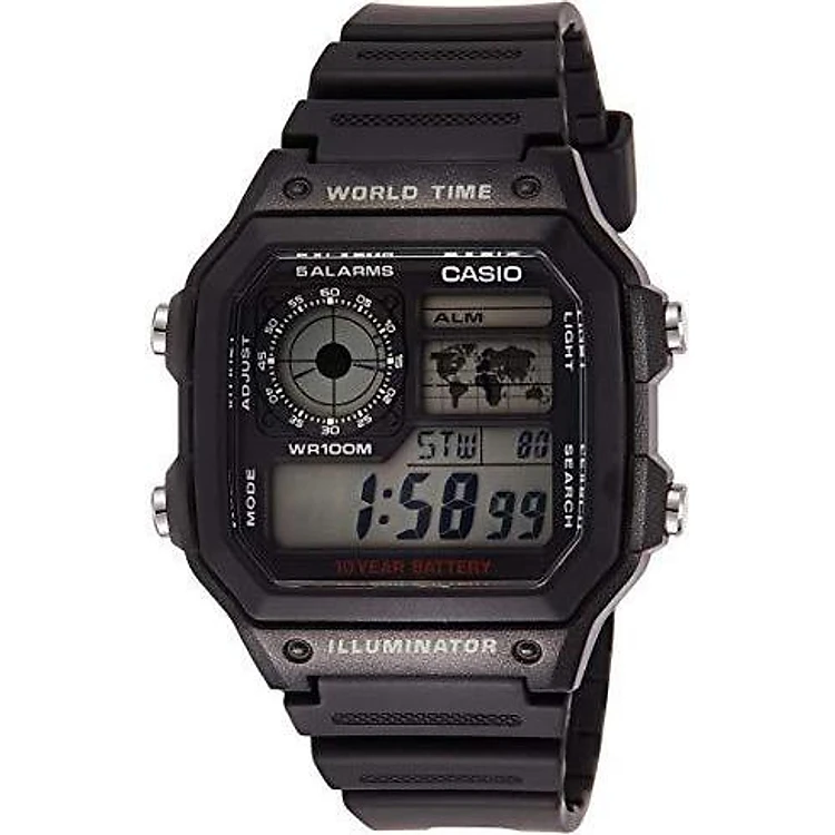 Stay on time with sophisticated yet sporty and casual designer style when you wear the Casio Men's Digital Watch. This smooth and sturdy resin men's wrist watch features a comfortable rolled strap with an adjustable buckle clasp closure, a square-shaped dial with sleek, angled edges, and a deluxe digital LED display with an afterglow; five daily alarms; a stopwatch function; a countdown timer; and a world map with foreign time indicators, and it offers both 12 and 24-hour formats. An extravagant yet remarkably affordable way to keep track of the time throughout your busy day