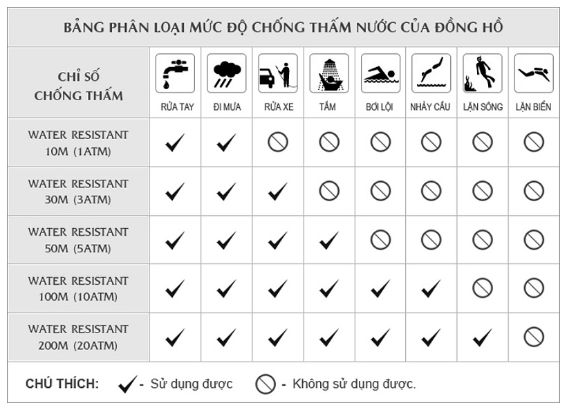 - Lưu ý đóng chặt núm điều chỉnh của đồng hồ sau khi chỉnh giờ hoặc lịch, để tránh nước có thể thẩm thấu vào bên trong đồng hồ. Việc thường xuyên đeo đồng hồ trong khi tắm nước nóng hoặc xông hơi cũng khiến khả năng chống thấm nước của đồng hồ bị suy giảm.