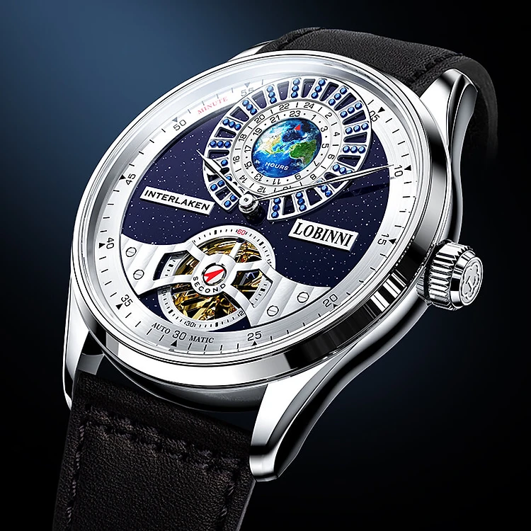 Đồng hồ nam chính hãng LOBINNI LB16038G-D2 Kính sapphire,Chống nước 50m,BH 24 tháng,Đồng hồ cơ (Automatic),mặt tròn lộ cơ dây da
