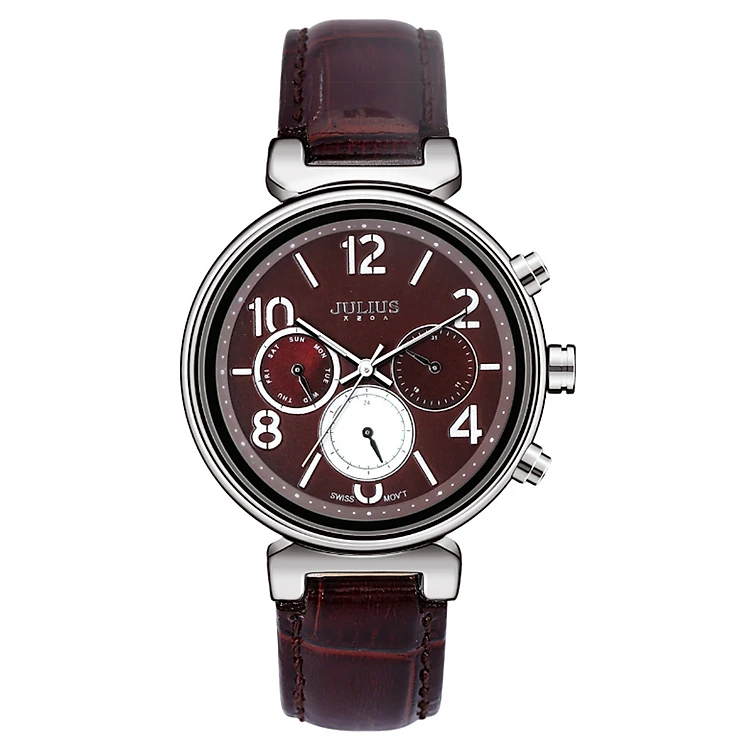 Đồng Hồ Nữ Dây Da Julius JA-850 - Nâu với độ chống nước 3ATM cho phép bạn rửa tay, đi mưa, rửa xe. Đồng hồ có thiết kế trẻ trung cùng màu nâu trang nhã, đường vân đẹp mắt sẽ là phụ kiện mang đến vẻ ngoài tinh tế nhưng cũng không kém phần hiện đại cho bạn. Thiết kế mặt tròn, 3 mặt nhỏ bên trong đẹp mắt, chạy cùng lúc thứ, ngày, sáng chiều hiện đại vừa mang đến sự tiện lợi cho bạn vừa mang đến vẻ ngoài nổi bật. Nút điều chỉnh ngày giờ bên hông cho bạn tiện lợi hơn khi sử dụng.