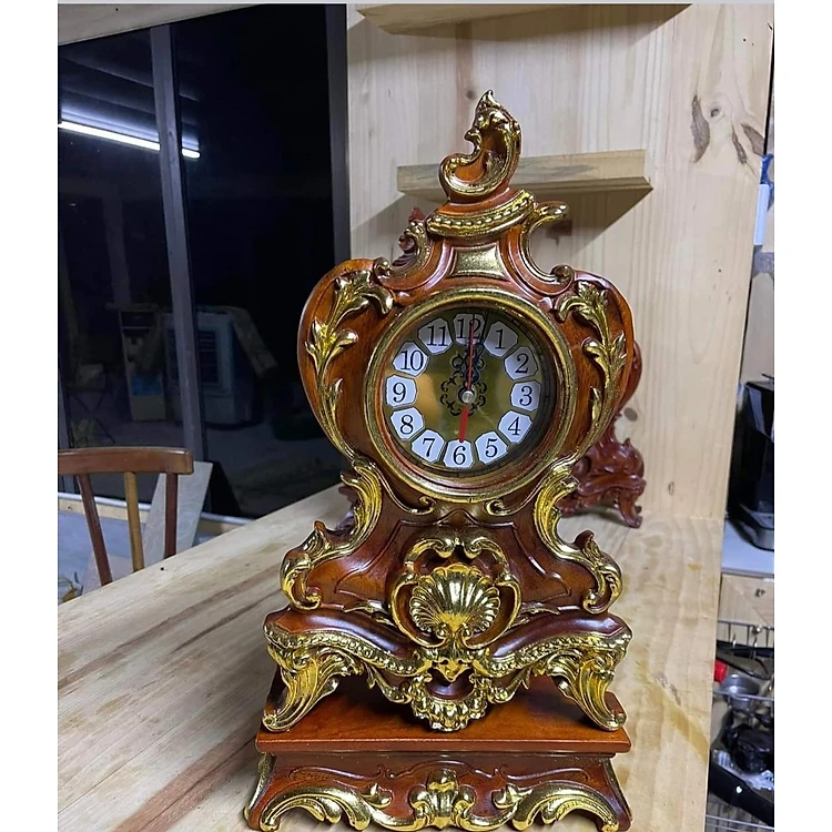 Đồng hồ phong thủy để bàn khắc hoa la tây cổ điển bằng gỗ hương dát vàng điểm cao cấp kt 46×27×13cm
