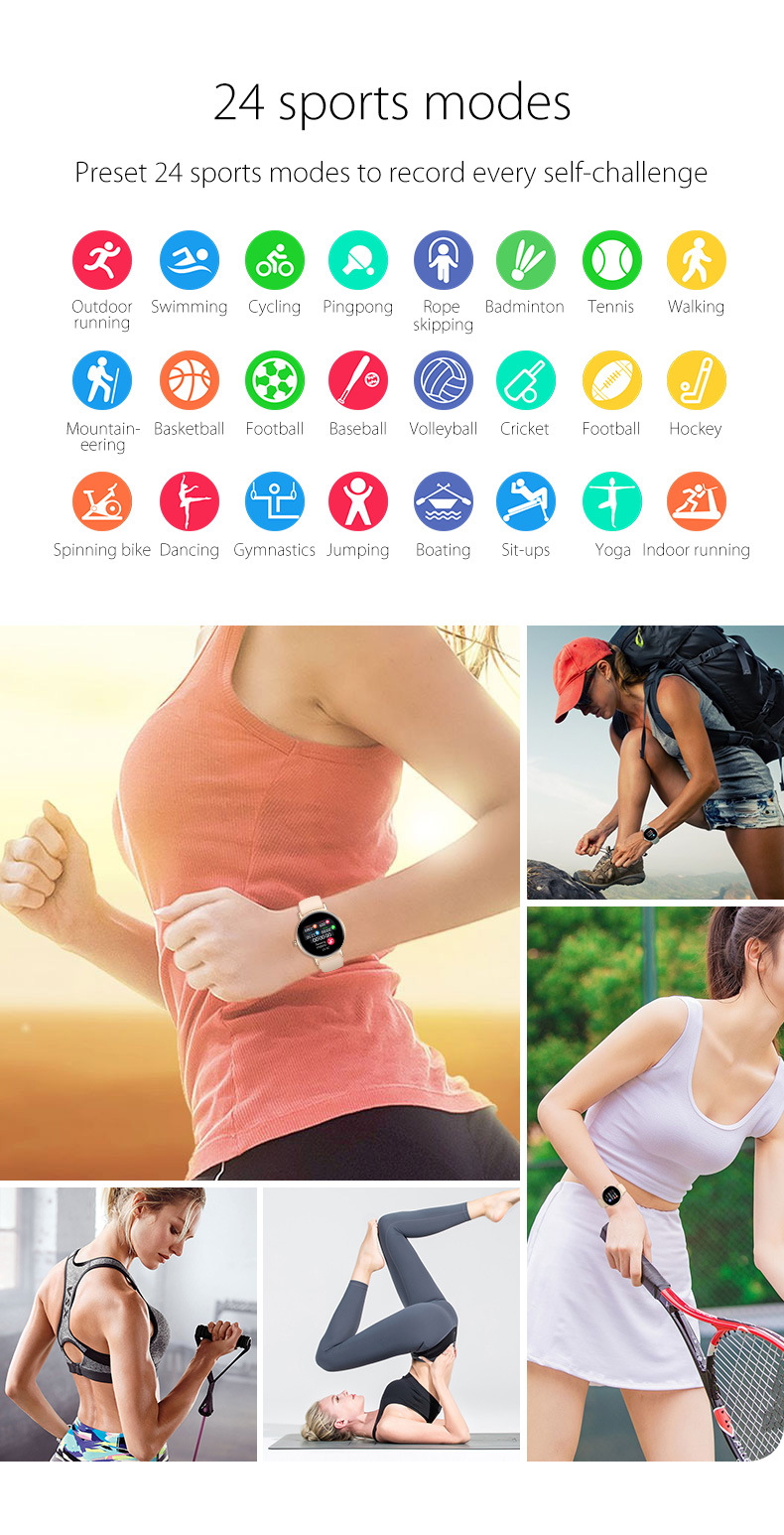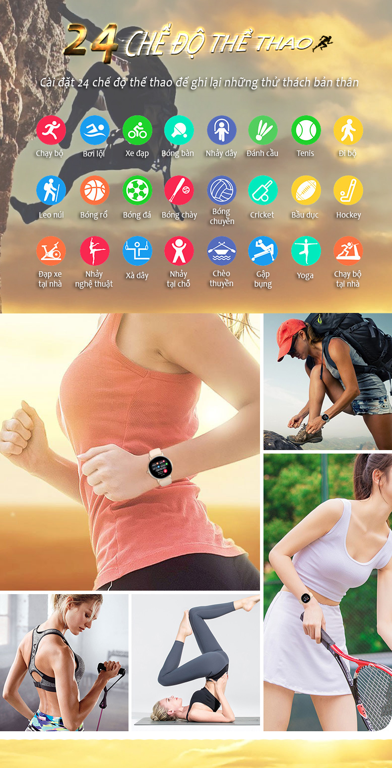 . Có tổng cộng 24 chế độ thể thao, bao gồm chạy ngoài trời, đạp xe, nhảy dây, bóng bàn, cầu lông, tennis, bơi lội, leo núi, đi bộ đường dài, bóng rổ, bóng đá, bóng chày, bóng chuyền, cricket , bóng đá, khúc côn cầu, khiêu vũ, Quay, Yoga, Ngồi dậy, chạy trong nhà, thể dục dụng cụ, Chèo thuyền, Nhảy dây