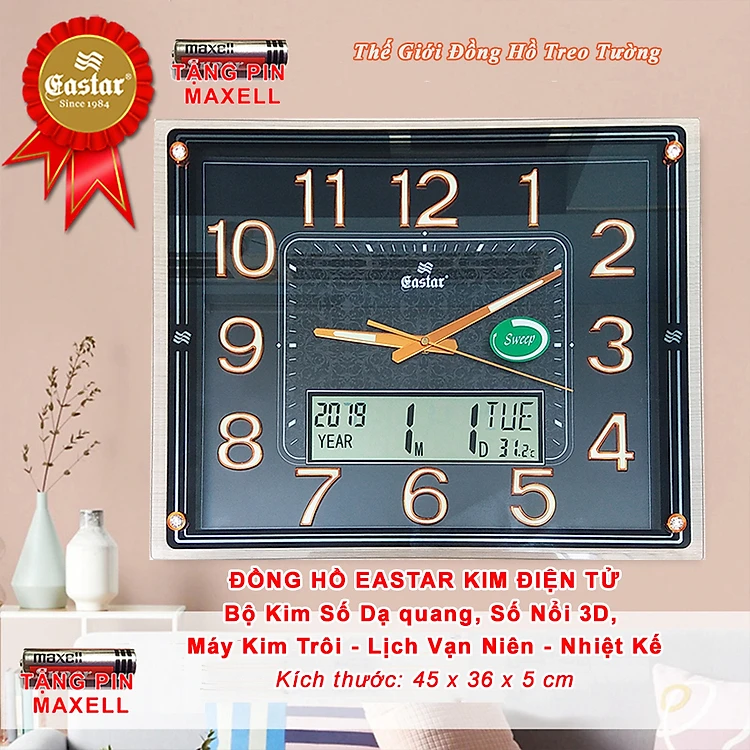 Đồng hồ Treo Tường EASTAR Kim Điện Tử KIM TRÔI Cao Cấp DẠ QUANG - LỊCH Vạn Niên và NHIỆT KẾ Điện Tử