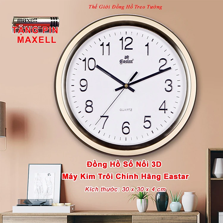 Đồng Hồ Treo Tường KIM TRÔI EASTAR Cao Cấp - Mặt Tròn Viền Vàng Kim Tuyến - Mặt số in Nổi 3D - Máy Kim trôi – Tặng Pin Maxell