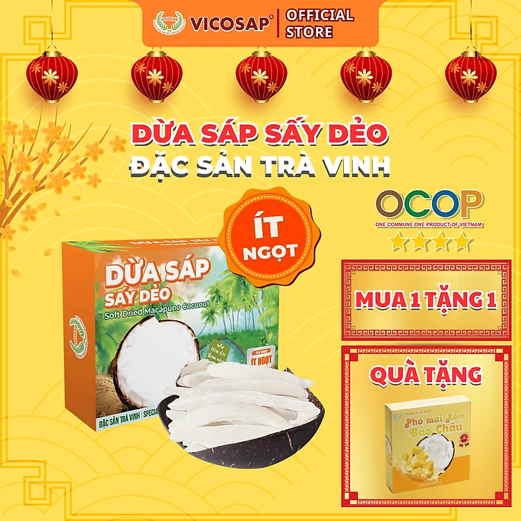 - Dừa sáp sấy dẻo là sự hòa quyện giữa độ béo dẻo đặc trưng và hương thơm đã trở thành biểu tượng của trái dừa sáp. Những cọng dừa sáp dẻo thơm, trắng tự nhiên, ngọt thanh thao gợi nhớ hương vị ngày lễ tết truyền thống.