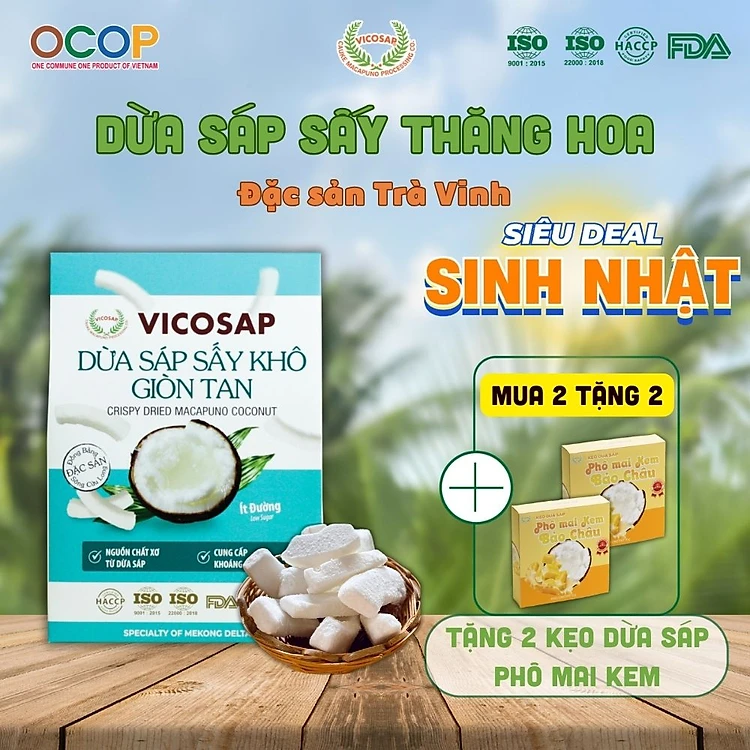 Dừa sáp sấy giòn cao cấp VICOSAP ít đường đồ ăn vặt healthy đặc sản Trà Vinh