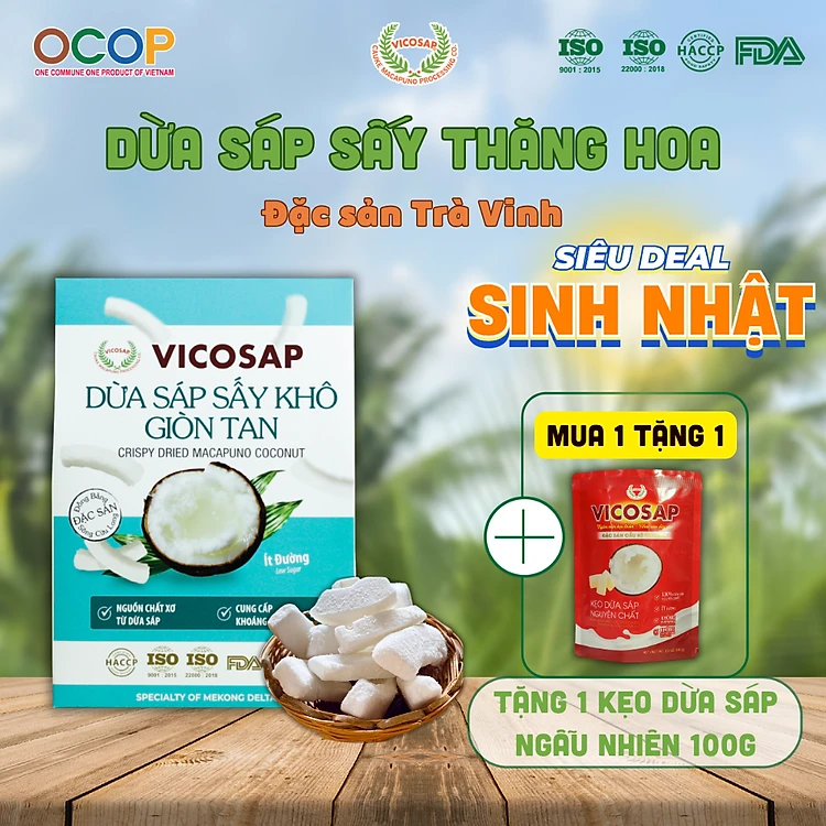 Dừa sáp sấy giòn cao cấp VICOSAP ít đường đồ ăn vặt healthy đặc sản Trà Vinh