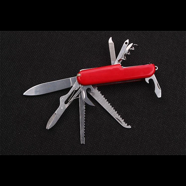 Bộ sản phẩm gồm: 1 dao lớn, 1 dao cắt bánh mì, kéo, đồ xỏ kim, 1 đồ mở nút chai dạng xoắn, 1 tua vít dạng nhỏ, đồ khui bia, dao cắt bánh kem, tăm ăn, khui đồ hộp, dũa móng tay.