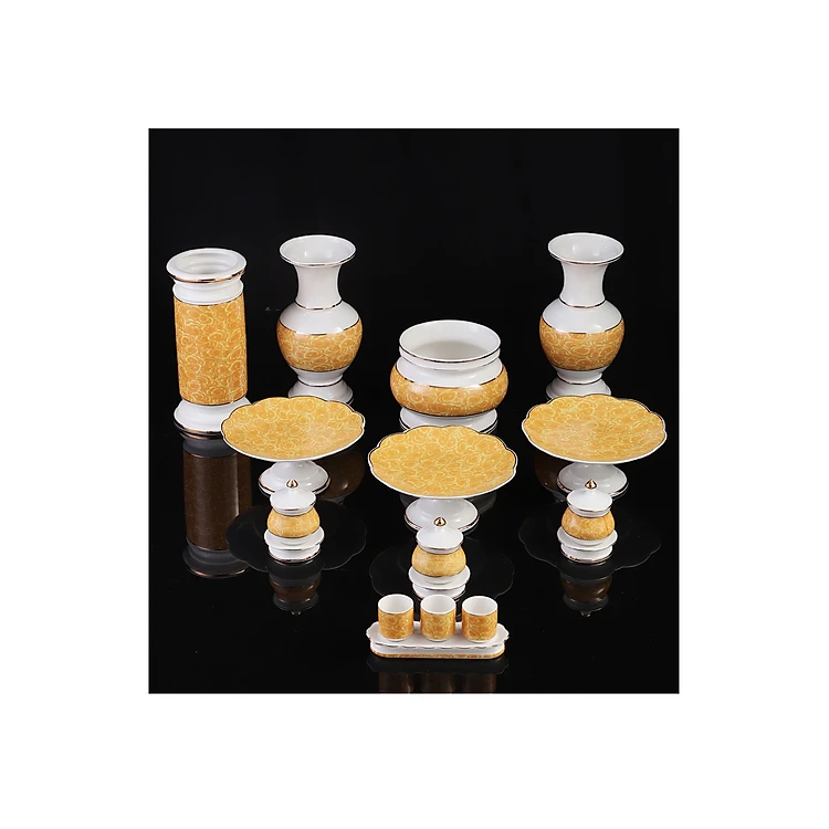 BỘ SẢN PHẨM THỜ CÚNG THƯỜNG BAO GỒM: 1 bát hương (lu hương), 2 bình bông, 2 đĩa trái cây, 3 hoặc 5 ly nước, 1 hoặc 2 đế nến, 3 chun nước (hũ gạo), 1 ống nhang