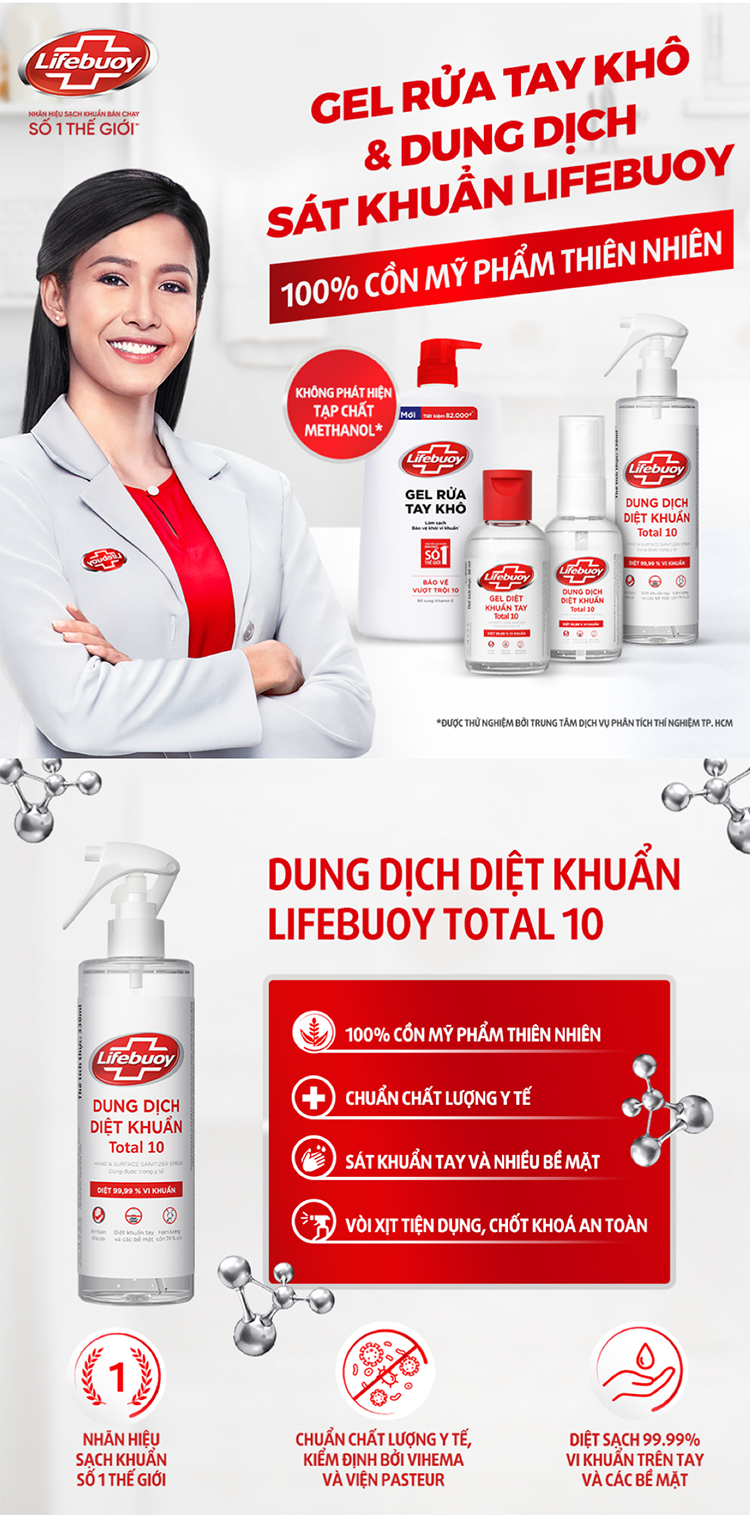 Với sứ mệnh bảo vệ toàn diện sức khỏe của người Việt, Lifebuoy - Nhãn hiệu sạch khuẩn SỐ 1 thế giới đã cho ra mắt Dung dịch diệt khuẩn Total 10 với công thức vượt trôi, chuẩn chất lượng y tế - diệt sạch 99,99% vi khuẩn, thích hợp sử dụng trong các trường hợp không có xà phòng hoặc nước.