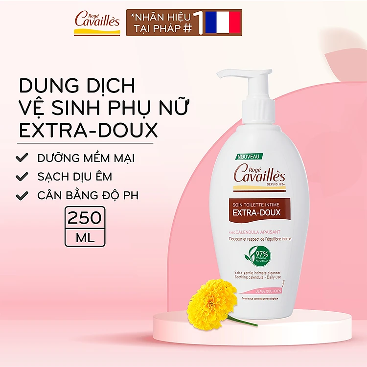 Dung dịch vệ sinh phụ nữ Roge Cavailles - Dưỡng Mềm Mại, Sạch Dịu Êm - Số 1 tại Pháp - 250ml