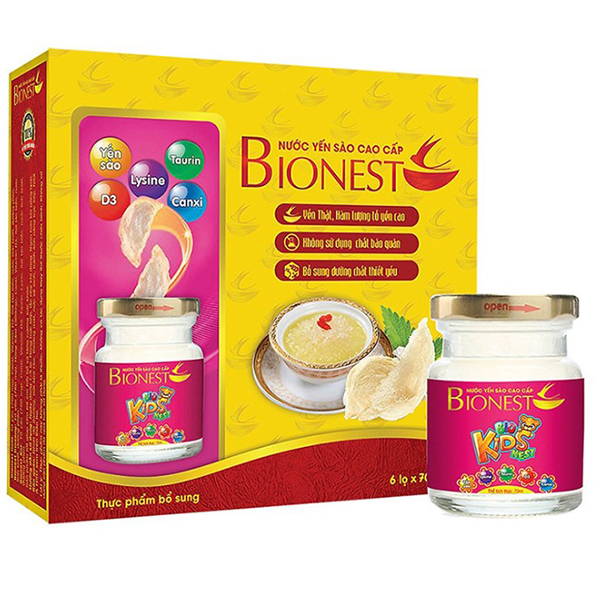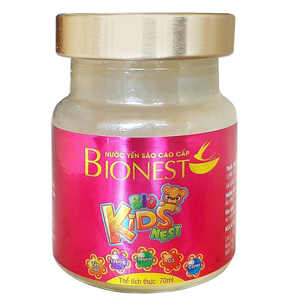 Yến sào cho bé biếng ăn Bionest Kids với thành phần từ yến sào thiên nhiên kết hợp với hồng sâm Hàn Quốc, giúp tăng cường sức khỏe một cách tự nhiên và an toàn. Lysin hỗ trợ trẻ biếng ăn, giúp ăn ngon... Taurine có tác dụng tham gia các quá trình chuyển hoá quan trọng trong cơ thể bé. Đặc biệt, Taurine có nhiều trong các mô cơ thể, trên võng mạc, bạch cầu, giúp cơ thể của chống ôxy hoá. Ngoài ra, Taurine còn hỗ trợ cho sự phát triển của hệ thần kinh trung ương và thị giác của bé. Bên cạnh đó, sản phẩm còn giúp bổ sung canxi giảm nguy cơ loãng xương. Vitamin D3 giúp cơ thể hấp thụ canxi, Vitamin D và canxi được sử dụng để điều trị hoặc ngăn ngừa chứng loãng xương, cải thiện sức khỏe răng miệng. Chất xơ hỗ trợ tiên hóa tốt cho bé. Sợi tảo biển giúp cung cấp một dưỡng chất cần thiết cho cơ thể phù hợp với hoạt động của cơ thể.