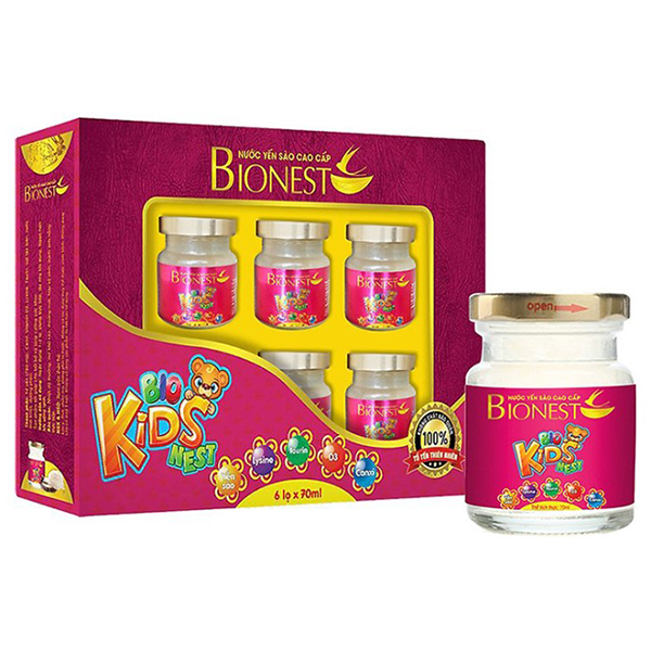 Yến sào cho bé biếng ăn Bionest Kids với thành phần từ yến sào thiên nhiên kết hợp với hồng sâm Hàn Quốc, giúp tăng cường sức khỏe một cách tự nhiên và an toàn. Lysin hỗ trợ trẻ biếng ăn, giúp ăn Taurine có tác dụng tham gia các quá trình chuyển hoá quan trọng trong cơ thể bé. Đặc biệt, Taurine có nhiều trong các mô cơ thể, trên võng mạc, bạch cầu, giúp cơ thể của chống ôxy hoá. Ngoài ra, Taurine còn hỗ trợ cho sự phát triển của hệ thần kinh trung ương và thị giác của bé. Bên cạnh đó, sản phẩm còn giúp bổ sung canxi giảm nguy cơ loãng xương. Vitamin D3 giúp cơ thể hấp thụ canxi, Vitamin D và canxi được sử dụng để điều trị hoặc ngăn ngừa chứng loãng xương, cải thiện sức khỏe răng miệng. Chất xơ hỗ trợ tiên hóa tốt cho bé. Sợi tảo biển giúp cung cấp một dưỡng chất cần thiết cho cơ thể phù hợp với hoạt động của cơ thể.