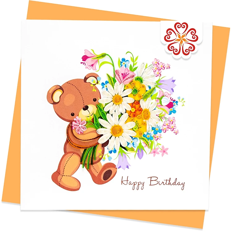 Em Gấu ôm bó hoa chúc mừng - Thiệp giấy xoắn 15 x 15 cm - Thiệp chúc mừng thủ công