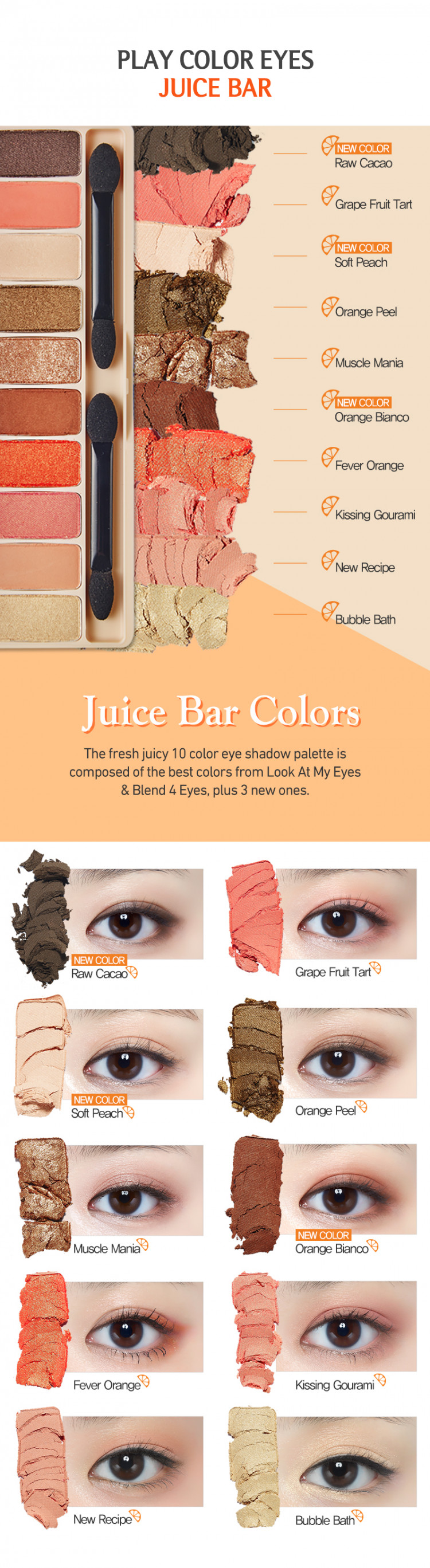 Với các màu nghiêng về tone ấm Etude House Play Color Eyes Juice Bar rất thích hợp sử dụng trong các dịp lễ hội mùa hè sôi động, đầy sắc màu.