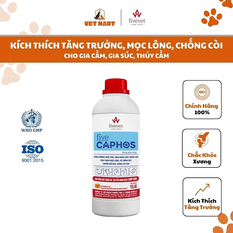 Five Caphos - Siêu tăng trưởng, kích thích mọc lông, chống còi, chống mổ cắn cho gia súc, gia cầm, thủy cầm 1LÍT_Fivevet