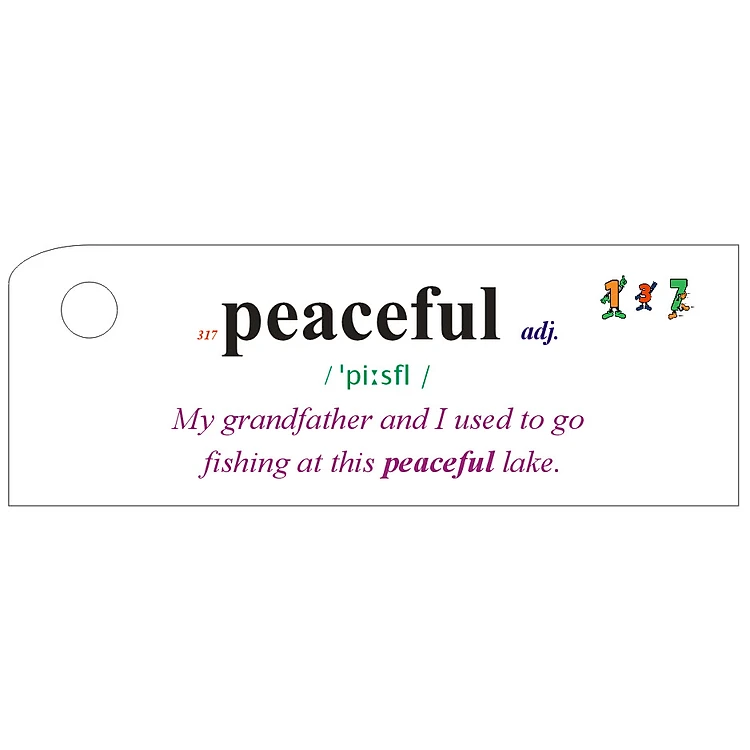 Bộ Flashcard bao gồm 44 thẻ từ giấy couche cứng định lượng 250mgs (dày gấp 3 double A 80) được cáng màng bóng nhựa hai mặt. Từng thẻ có kích thước 9 x 3.8 cm với bo góc có khoan lỗ một giúp cho bạn có thể xỏ những thẻ lại với khoen tròn inox đi kèm để tiện cho việc mang theo bên mình. 2 mặt của thẻ được in ấn kĩ lưỡng cho nội dung và hình ảnh rõ nét, dễ nhìn.