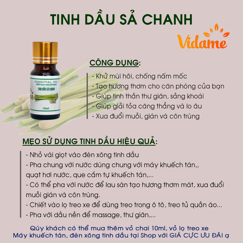 + Tinh dầu sả chanh 100% thiên nhiên: Được chiết xuất từ cây sả, xả chanh.