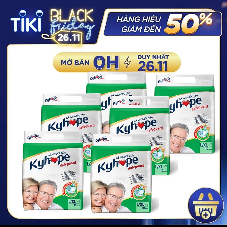 Bộ 6 gói Tã Dán KYHOPE Safeguard size L/XL công nghệ Nhật Bản kháng khuẩn, loại bỏ mùi, gói 10 miếng dành cho người lớn