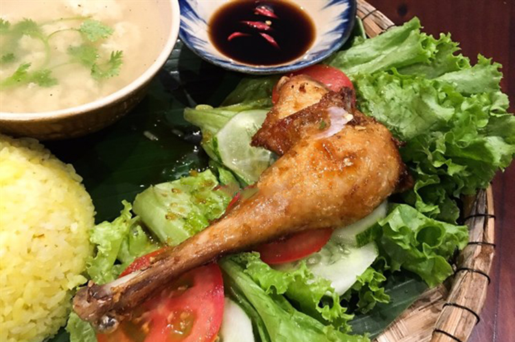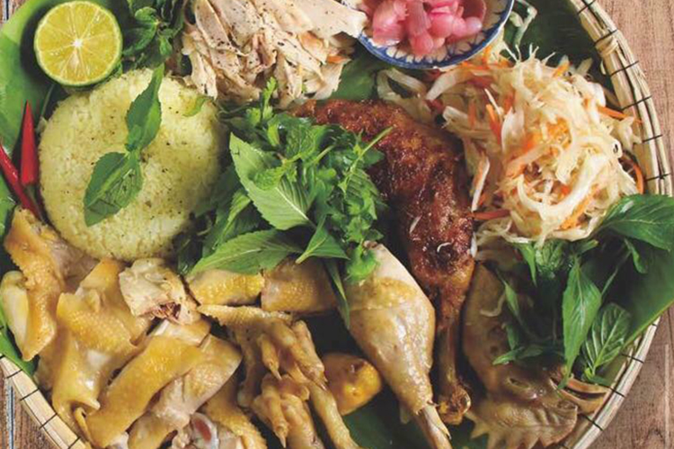 Điểm gây ấn tượng đầu tiên với thực khách phải kể đến là hình thức trình bày vô cùng đẹp mắt. Chiếc mẹt tre lót lá chuối đựng đầy ắp đồ ăn bên trên gợi lại cho bạn hình ảnh của những bữa cơm làng quê mộc mạc. Trong ấy nổi bật lên lớp da vàng mật ong óng ánh của món Gà quay tạo nên một bố cục vô cùng hài hòa. Bên cạnh còn có chén nước mắm ngọt tỏi ớt và chén muối ớt tắc đúng điệu ẩm thực Việt.