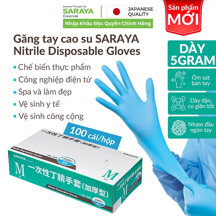Găng tay cao su Saraya Nitrile Loại Dày 5Gram Không Bột, dùng trong chế biến thực phẩm, làm đẹp, vệ sinh - 100 cái/hộp