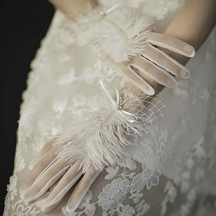 Găng tay trong suốt đính lông vũ, ngọc trai và ren lưới cho Cô dâu và Dạ hội, đi tiệc, sự kiện, lễ hội, chụp ảnh MS: 43750