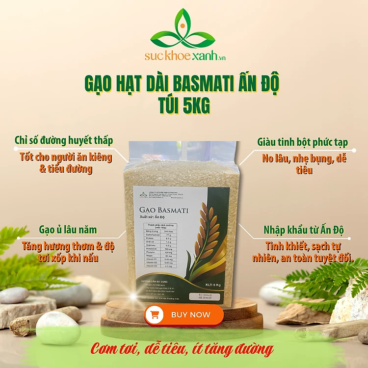 Giàu Dinh Dưỡng: Gạo Basmati chứa nhiều chất dinh dưỡng quan trọng như carbohydrate phức hợp, vitamin B, và các khoáng chất cần thiết như sắt và magiê. Việc sử dụng gạo Basmati trong bữa ăn hàng ngày giúp cung cấp năng lượng và hỗ trợ sức khỏe toàn diện. Ngoài ra với chỉ số GI thấp, Gạo Basmati còn là lựa chọn hàng đầu của những người cần kiểm soát chỉ số đường huyết.