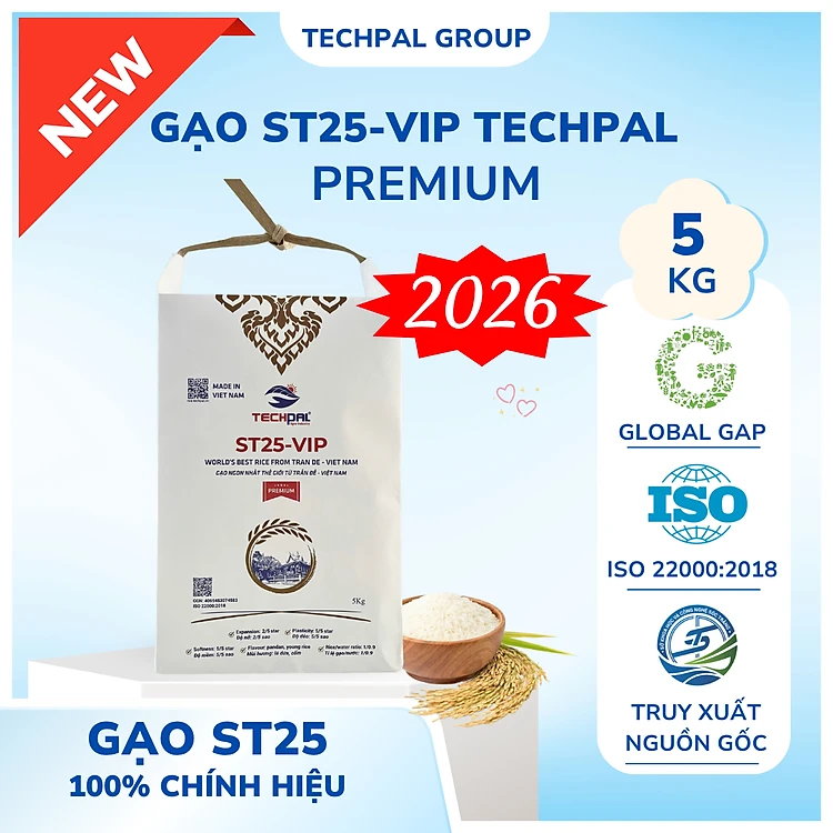 Gạo ST25-VIP Premium TECHPAL túi giấy 5Kg | Phiên bản 2026 | Đạt chuẩn Global GAP