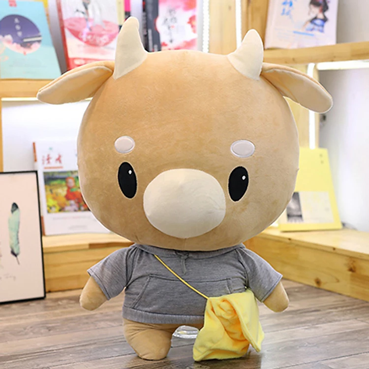 - Bò chăm chỉ được làm bằng vải nhung mềm mại, nhồi 100% gòn bông đàn hồi. Đường kim mũi chỉ tinh tế, đẹp mắt.