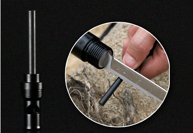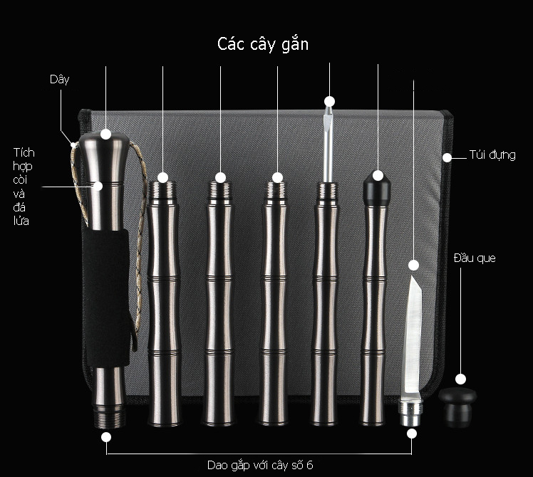 • Tích hợp dao, đá lửa, la bàn, đầu nhọn phá đá, gỗ, kính.