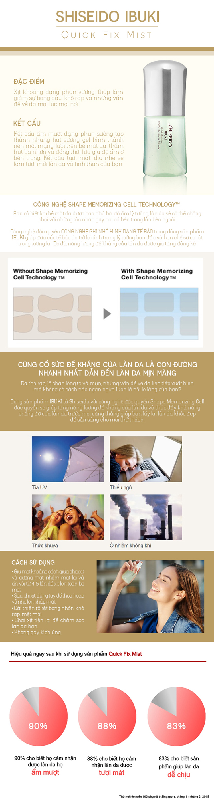 - Gel Dưỡng Da Dạng Xịt Shiseido Ibuki Quick Fix Mist (50ml) - 11951 dạng phun sương giúp làm giảm sự bóng dầu, khô ráp và mọi vấn đề về da mọi lúc mọi nơi. Những hạt sương gel hình thành nên một mạng lưới trên bề mặt da, thấm hút bã nhờn và đồng thời lưu giữ độ ẩm ở bên trong.
