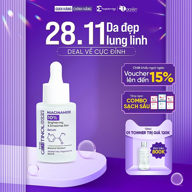 Serum trắng hồng da Niacinamide kiểm soát dầu, mụn, dưỡng trắng, giảm nếp nhăn, trẻ hóa làn da The Gentinol 0221 30ml