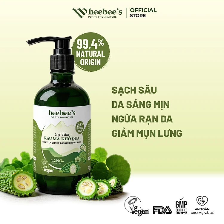 Gel Tắm Rau Má Khổ Qua Rừng Thuần Chay Heebee's Giảm Rôm Sẩy, Dưỡng Ẩm, Da Sáng Mịn Màng 300/500ML